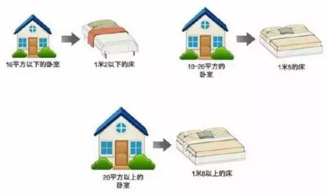 ▲10平方米的臥室配1.2m一下的床,10平方米至20平方米配1.5m的床,20平方米以上的臥室需要配1.8m以上的床。